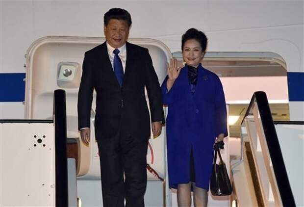Chinese President Xi Jinping and his wife Peng Liyuan leave their plane as they arrive at Heathrow Airport, London, Monday, Oct. 19, 2015.
